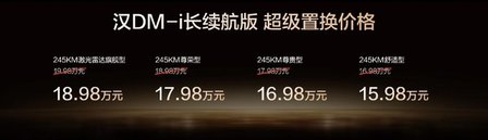 此次,漢DM-i長續航版共推出4款車型,補貼后售價15.98萬~18.98萬元;漢EV長續航版共推出3款車型,補貼后售價17.38萬~20.58萬元(10月31日前完成購車可享1萬元超級置換補貼)。