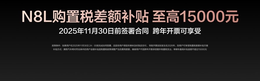 為回饋廣大用戶的支持與信賴,騰勢N8L特別推出限時購車權益,權益價值至高10.67萬元!包括價值1.7萬元的三年免息,最高1萬元的置換補貼。此外,不必擔心因為交車晚,享受不到購置稅補貼:在2025年11月30日24點前完成合同簽署的用戶,如果因非用戶原因車輛未及時交付,導致開票實際發生在2026年,可享受購置稅差額補貼,最高1.5萬元!