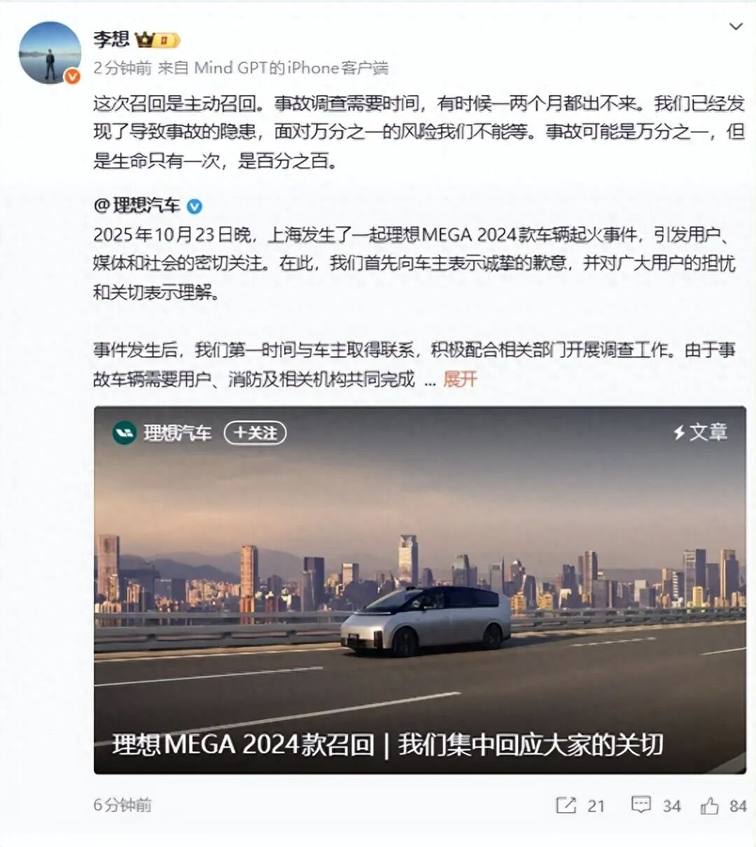 與上述品牌紛紛創(chuàng)下新高的火熱表現(xiàn)形成鮮明對(duì)比的是,理想汽車10月交付新車31,767輛,同比下滑38%,環(huán)比下滑6.43%,成為頭部新勢(shì)力中唯一出現(xiàn)同比環(huán)比雙下滑的企業(yè)。有行業(yè)分析師認(rèn)為,理想汽車的銷量波動(dòng)主要源于兩方面:一方面,9月26日上市的理想i6雖訂單量超過(guò)7萬(wàn)臺(tái),但產(chǎn)能尚未完全釋放,影響了交付量;另一方面,其主力增程車型面臨日益激烈的市場(chǎng)競(jìng)爭(zhēng),L9、L8被問(wèn)界M8/M9擠壓份額,L7則遭遇問(wèn)界新M7的沖擊。與此同時(shí),理想汽車在10月還面臨了突發(fā)性的品牌挑戰(zhàn)——10月23日上海一輛理想MEGA在無(wú)碰撞情況下發(fā)生自燃事件,雖然理想汽車于10月31日快速啟動(dòng)主動(dòng)召回,但這一事件無(wú)疑對(duì)品牌形象造成了一定影響。