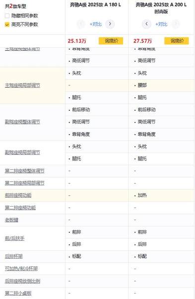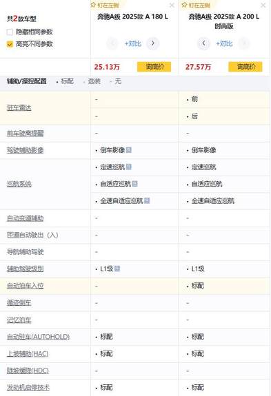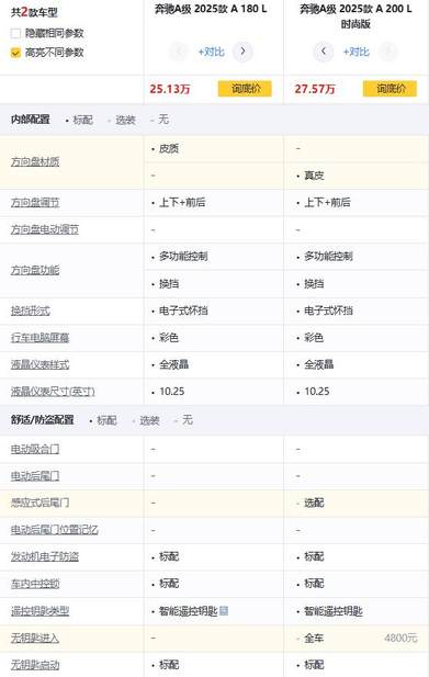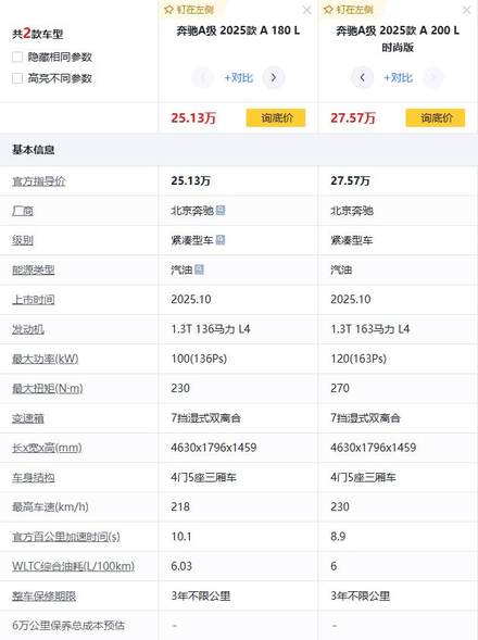 對于許多初次購買豪華轎車的消費者而言,奔馳A級無疑是一個極具吸引力的選擇。2025款改款奔馳A級已于2025年10月正式上市,共推出兩款車型:A 180 L(官方指導價25.13萬元) 與 A 200 L時尚型(官方指導價27.57萬元),兩者相差2.44萬元。那么這2.44萬元的差價到底值不值得花?我們就來深入解析奔馳A級車系的配置差異,幫您找到最適合自己的選擇。