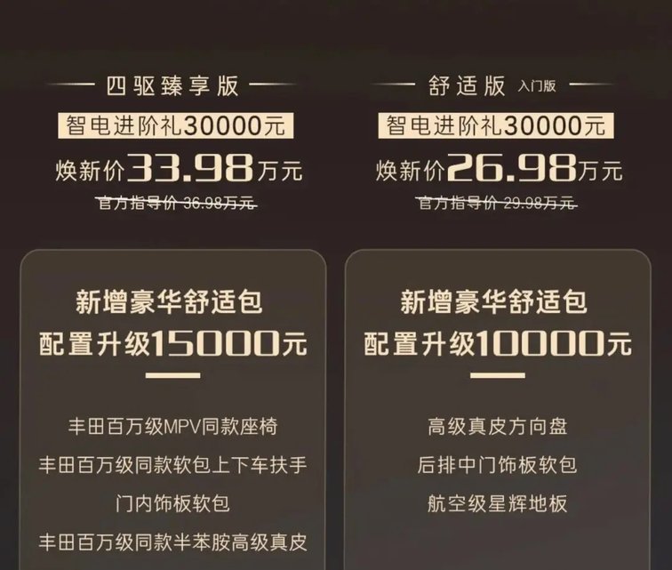 再往上加2.5萬到尊貴版,34.98萬元,適合注重細節的家庭。20英寸大輪轂不僅好看,過彎支撐性也更好;安全配置多了并線輔助和倒車碰撞預警,變道、倒車時能少很多刮蹭焦慮。最實用的是360°全景影像+透明底盤,窄路會車、停車時,車身周圍情況一目了然,新手也能輕松駕馭。二排座椅還加了通風功能,夏天前后排都不悶汗,長途乘坐舒適度提升一大截。北方用戶同樣可以加1萬選四驅版,兼顧配置和通過性。臻享尊貴版比尊貴版貴1萬,核心升級是二排座椅按摩功能,16點式按摩能緩解長途疲勞,座椅還用了半苯胺真皮,質感更高級。但有個取舍——取消了后排側安全氣囊,家里有小孩的話,可能會更在意安全配置,這1萬值不值就見仁見智了。