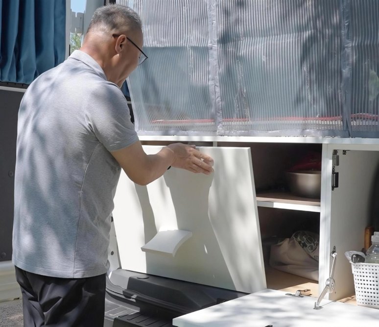 經濟實用,安全至上是老趙的改裝理念。專業改裝廠安裝12度電,解決長途用電焦慮,他強調“涉及安全的事必須交給專業的人”;18元自制紗簾、兩張1.1×1.8米的雙人床,則全部出自他的雙手。車內的改裝一切圍繞“住宿”與“生活”展開,廚房系統、儲物空間皆以簡馭繁,拒絕華而不實。改裝不為炫耀,只為踏實生活。