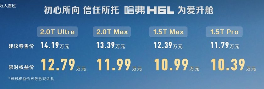 官方將哈弗H6L的核心價格標簽定為 “#10.39萬起買大五座SUV”。從配置清單看,前排座椅加熱、通風、按摩、64色氛圍燈、10英寸HUD抬頭顯示等傳統意義上的“高配”功能紛紛下放,頂配不到13萬即可擁有2.0T+9DCT動力總成。