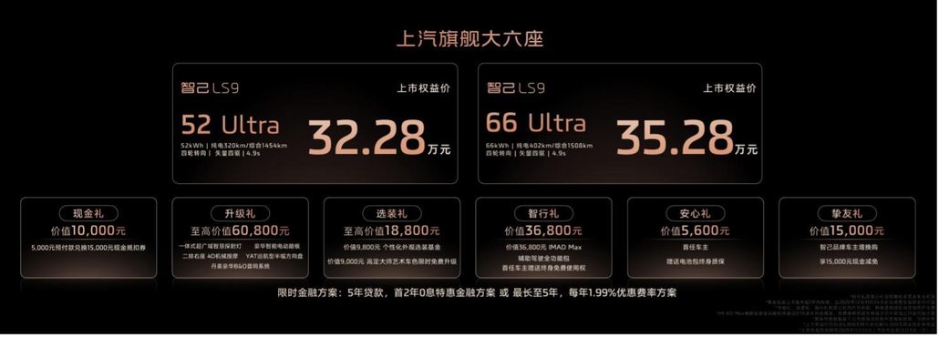 更震撼的是,智己LS9上市權(quán)益誠意爆棚,將奢華B&O音響系統(tǒng)、二排右側(cè)4D機(jī)械按摩、一體式超廣域智慧探射燈、豪華智能電動(dòng)踏板等旗艦豪華配置,統(tǒng)統(tǒng)限時(shí)免費(fèi)升級!新車震撼發(fā)布兩個(gè)超級增程版本:智己LS9 52 Ultra版上市權(quán)益價(jià)32.28萬元,入門即巔峰,以30萬出頭的價(jià)格,享受時(shí)代最旗艦的滿配大六座;智己LS9 66 Ultra版,更搭載66度寧德時(shí)代超級驍遙MAX電池,將續(xù)航和性能推向極致,上市權(quán)益價(jià)35.28萬元,一錘定音30萬級最強(qiáng)旗艦爆品。