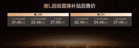 此次,唐L EV 3款車型,補貼后售價22.48萬~27.48萬元;唐L DM 3款車型,補貼后售價21.48萬~27.08萬元;同時,比亞迪還為用戶準備了包含置換補貼在內的至高價值4.5萬元尊享禮遇,讓旗艦體驗觸手可及。