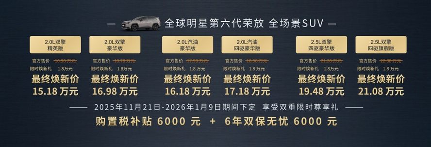 全新榮放在外觀、智能座艙、動力、智駕輔助、安全配置等方面全面升級,全系商品力提升達到1.5萬元水平,增配價更低,誠意滿滿。不僅如此,為回饋廣大用戶的支持,11月21日起到2026年1月9日期間,確定為“限時尊享下定期”。期間預訂用戶,將享有高達1.8萬元的現金直給,以及購置稅補貼6000元,價值6000元售后服務權益的雙重限時大禮包。