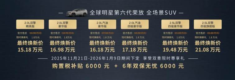 全新榮放在外觀、智能座艙、動力、智駕輔助、安全配置等方面全面升級,全系商品力提升達到1.5萬元水平,增配價更低,誠意滿滿。不僅如此,為回饋廣大用戶的支持,11月21日起到2026年1月9日期間,確定為“限時尊享下定期”。期間預訂用戶,將享有高達1.8萬元的現金直給,以及購置稅補貼6000元,價值6000元售后服務權益的雙重限時大禮包。