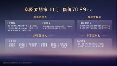 【2025年11月21日 廣州】11月21日,廣州車展盛大啟幕,“新時代旗艦四座MPV”嵐圖夢想家山河正式上市,售價70.99萬元。同步推出山河專屬四重禮,包含皓月紫云/拂曉金輝尊屬雙色車身、20英寸高定星漩輪轂(帶嵐圖懸浮徽標),及殿堂級丹拿品質音響;華為乾崑智駕ADS 4高階功能包現金抵扣;超級置換補貼;專屬定制VIN碼權益;三電系統終身質保、車機流量終身免費、道路救援終身免費等權益。