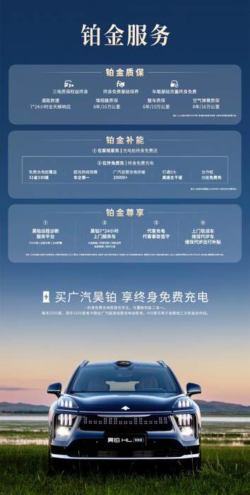除了購車禮遇,廣汽昊鉑更為用戶提供“鉑金服務”保障,提供終身三電質保、終身免費充電等涵蓋質保、補能、服務的多維度權益,打造無憂用車體驗。