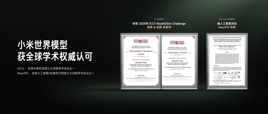 目前,小米世界模型已獲得全球學術權威的認可:小米的ViSE 算法在 ICCV 2025 - 自動駕駛方向仿真合成數據專業挑戰賽中榮獲冠軍;小米生成模型的相關論文被NeurIPS 所收錄。ICCV是全球計算機視覺三大頂級學術會議之一,NeurIPS是全球人工智能/機器學習領域三大頂級學術會議之一。