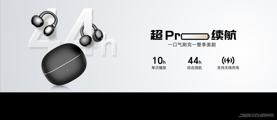 榮耀耳夾耳機2 Pro綜合續航長達44小時,單次播放可達10小時,大幅領先同類產品的續航能力,充滿一次電,就可實現一口氣刷完一整季美劇,并支持無線充電與快充兩種功能,其中快充功能實現充電10分鐘使用3小時,徹底告別續航焦慮。