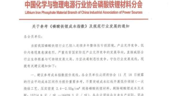 前者,是11月18日,中國化學與物理電源行業協會發布了通知,關鍵信息為,動力電池企業需要將協會所披露的平均成本作為報價的重要參考,不要突破成本紅線低價傾銷。