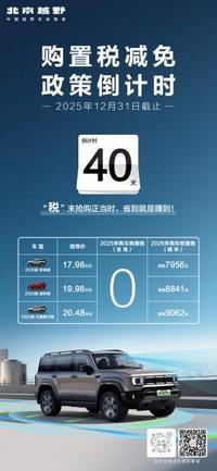 “稅”末搶購正當時,省到就是賺到!一邊是國家層面的免征購置稅“末班車”,一邊是北京越野誠意滿滿的廠補福利。在雙重利好疊加下,當前無疑是入手北京越野的最佳時機。北京越野政策+企業的福利組合,也為消費者構建了一套完整的購車成本減負體系,從核心稅費到購車補貼,全方位降低購車壓力,讓消費者感受到實實在在的誠意。