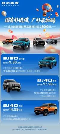 其中,BJ30旅行家指導價9.99萬元起,廠補至高補貼18000元,還享1000可抵3000元購車基金優惠(抵保險、購置稅);BJ40增程指導價17.98萬元起,廠補至高10000元,還享1000元抵4000元購車款優惠(不含元境智行版);BJ40燃油指導價14.99萬元起,廠補至高8000元,還享標準版1000元可抵3000元購車款優惠。此次廠補優惠截止時間為2025年11月30日,與“雙11萬人團購狂歡月”政策不同享。