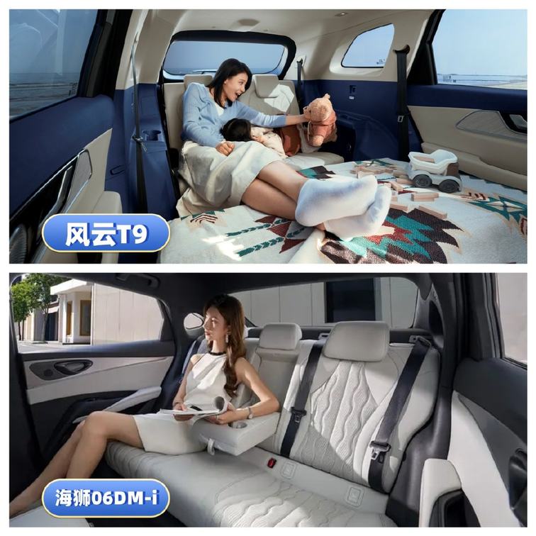 前女排國腳趙蕊蕊(身高超1.9米)的實測體驗極具參考價值:坐進風云T9依然寬敞舒適;即使第三排坐入170cm的成年人,短途乘坐也不會感到壓抑。而海獅06DM-i的2750mm軸距比風云T9短20mm,雖然前排與第二排空間足夠寬敞,但缺乏第三排的靈活性,面對多人口家庭的出行需求時,難免顯得局促。舒適配置上,風云T9的女王副駕配備10點按摩功能,配合SONY14揚聲器音響,能緩解長途乘車的疲勞;海獅06DM-i則僅提供普通皮質座椅與基礎音響系統,舒適體驗稍遜一籌。
