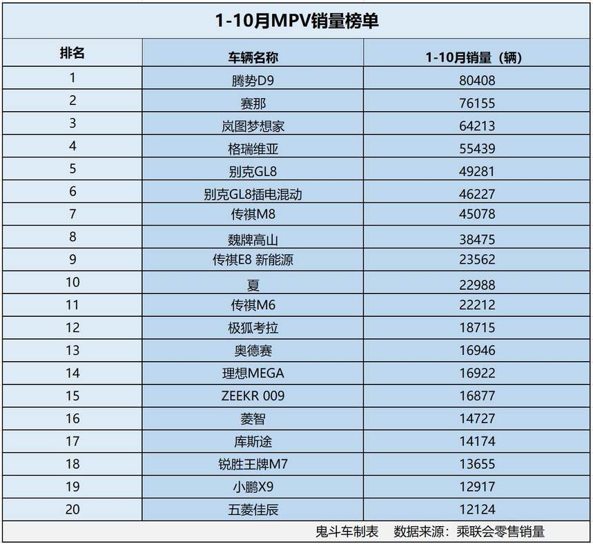 市場看著熱鬧,新車與老款車型之間競爭升級,但這一細(xì)分市場銷量表現(xiàn)很一般。日前,乘聯(lián)會發(fā)布1-10月零售銷量數(shù)據(jù),鬼哥整理出1-10月MPV市場銷量排名前二十榜單,結(jié)果,鬼哥發(fā)現(xiàn),整個榜單上沒有一款車型1-10月累計零售銷量達(dá)到10萬輛。接下來,看看具體車型排名?