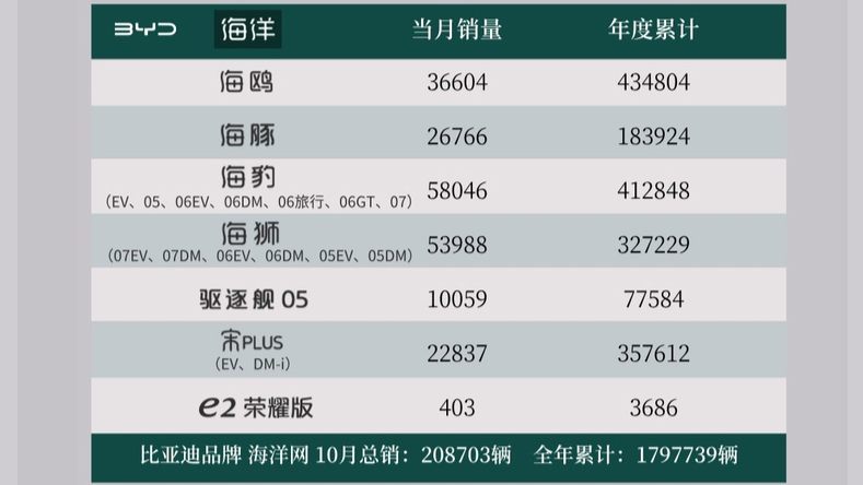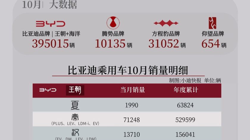 2025年1-10月,比亞迪王朝網銷量超過154萬輛,比亞迪海洋網超過179萬輛,騰勢銷量超12萬輛,方程豹銷量超20.8萬輛,仰望超0.3萬輛。