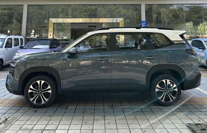 側(cè)面造型非常板正,一看就是典型的SUV風格。細節(jié)方面,新車采用了傳統(tǒng)門把手的設(shè)計,輪拱處還有黑色塑料材質(zhì),因此給人一種很能造的感覺。雙色車身的設(shè)計,看上去也不會過于單調(diào)。