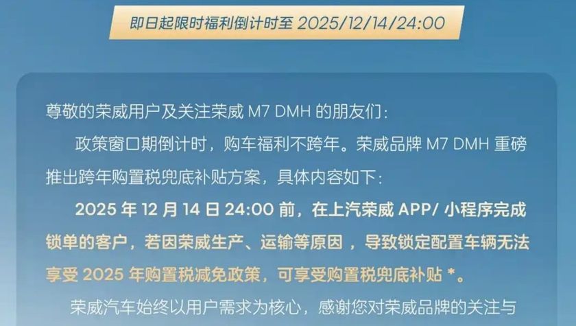 而最新一輪的政策兜底中還分成2種,一是以12月15日左右為截止日期的,還有一種是真的以12月31日為鎖單截止日期的。前者,就比如最新的榮威M7 DMH,其鎖單截止日期為12月14日24:00。本質(zhì)上,這相當于車企在兜底的過程中,在盡量保護自己。換句話說就是,風(fēng)險最小化,或者是性價比最大化。