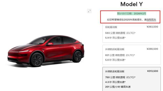 不過,特斯拉和上述幾家的還不太相同。12月1日時,特斯拉官網(wǎng)完成了更新,Model Y的后輪驅(qū)動版將2026年1月交付,長續(xù)航版則在2026年2月交付,目前熱度最高的Model Y L則為4-8周。