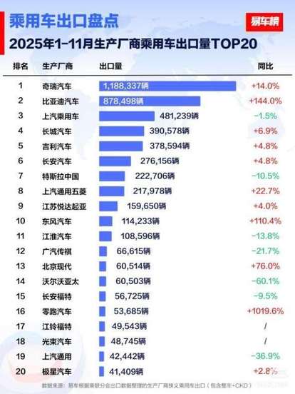 據易車數據顯示,2025年11月,比亞迪乘用車出口量達到12.8萬臺,同比增長313.4%;今年1-11月累計出口87.8萬臺,同比增長144%,較2024全年總出口量已實現翻倍式增長,比亞迪成為中國出口增速最快的車企之一。