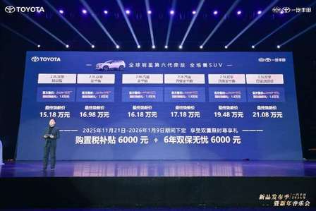第六代新榮放延續豐田全球血統,采用 “小普拉多” 方盒子造型與 “錘頭鯊” 前臉,全系標配 C 型 LED 大燈和超大防護飾板,寬 D 柱設計強化安全感。座艙打造 “功能島” 精簡按鍵,后排純平放倒可變 1.5 米大床,2.5 雙擎版支持 1500 瓦外放電。智能配置搭載 15.6 寸中控屏 + 高通 8155 芯片、26.4 寸巨幅 HUD 及 4 音區 AI 助手;動力提供 2.0L 汽油、2.0L 及 2.5L 智能電混雙擎三種選擇。 "官方標注油耗"百公里4.59升,但在中汽中心實車測試中,一箱油行駛超過1400公里,百公里油耗僅3.99升。安全方面配備 TSS 4.0 智駕系統、24 個高精度傳感器及A/B 柱1470 兆帕超高強度鋼。
