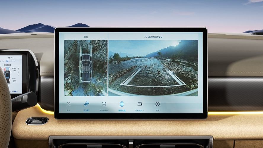 鋒坦Frontier Pro全系標配540°全景影像,讓視野無盲區:透明底盤讓你清楚看到車底障礙物,透明引擎蓋顯示前方落石情況,拖車影像則讓掛載露營裝備時輕松掌握全局。無論你是在狹窄的山谷中倒車,或者在城市地下車庫穿梭,這套系統都能幫你穩穩避開潛在危險。