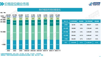 從價格表現上看,2025年相比2024年,細分市場里最大的變化在于20-30萬元之間,在車企的銷量和利潤貢獻中越來越重要。按照乘聯會統計數據,2024年開始,原本市占率不超過14%的它,猛增至15.7%。而2025年1-11月至今,它的整體份額已經占到了16.2%。
