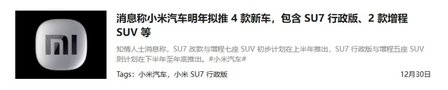 就在前不久,我們從網上了解到的信息來看,小米汽車將在2026年推出四款新車,包含小米SU7改款、小米SU7行政版、一臺增程五座SUV和一臺增程七座SUV。