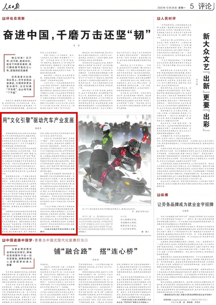 《人民日報》也進一步肯定魏建軍“文化引擎”理念對于汽車產業的重要價值。文章中,魏建軍強調中華文化賦予汽車產業更深厚的底蘊與支撐,長城汽車將堅持科技與文化兩手抓、兩手硬,打造讓國人自豪的民族品牌!