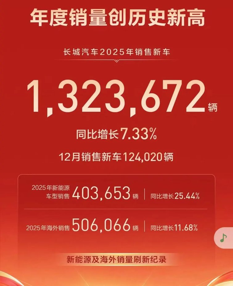 第五名,長城汽車,12 月銷量12.40 萬輛,同比下滑 8.33%。2025年全年銷量1323672輛,同比增長7.33%。其中全年新能源銷量403653輛,同比增長25.445;海外銷量506066輛,同比增長11.68%。