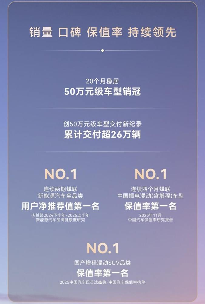 除了銷量與交付量持續攀升,問界M9更以凈推薦值、保值率雙第一的成績,穩坐豪華汽車市場標桿席位。在中國汽車流通協會發布的《2025年11月中國汽車保值率研究報告》中,問界M9已連續四個月蟬聯中國插電混動(含增程)車型保值率第一,并在2025中國汽車巴芒達盛典“中國汽車保值率榜單”中位列國產增程混動SUV第一,展現50萬級豪華車價值新高度。在杰蘭路2024下半年-2025上半年新能源汽車品牌健康度研究中,問界M9連續兩期獲得新能源全車型用戶凈推薦值第一。此外,在中國質量協會發布的2025年中國新能源汽車行業用戶滿意度指數評測結果中,問界M9榮獲第一名,并在J.D. Power 魅力指數榜單中位列豪華插電混動SUV第一……這一系列殊榮,共同印證了這款現象級產品在新能源豪華車市場的標桿實力。