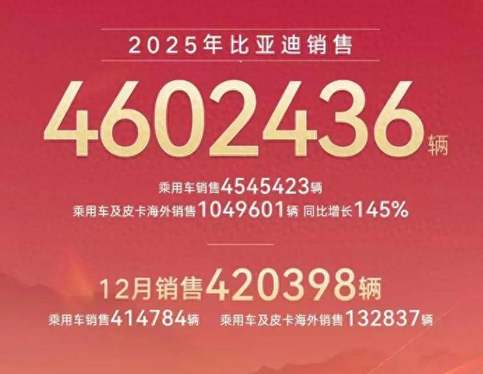比亞迪在12月出現了約18.2%的同比下滑,這直接影響了月度大盤。但另一項數據更值得關注:其海外年銷量首次突破100萬輛,同比猛增145%。