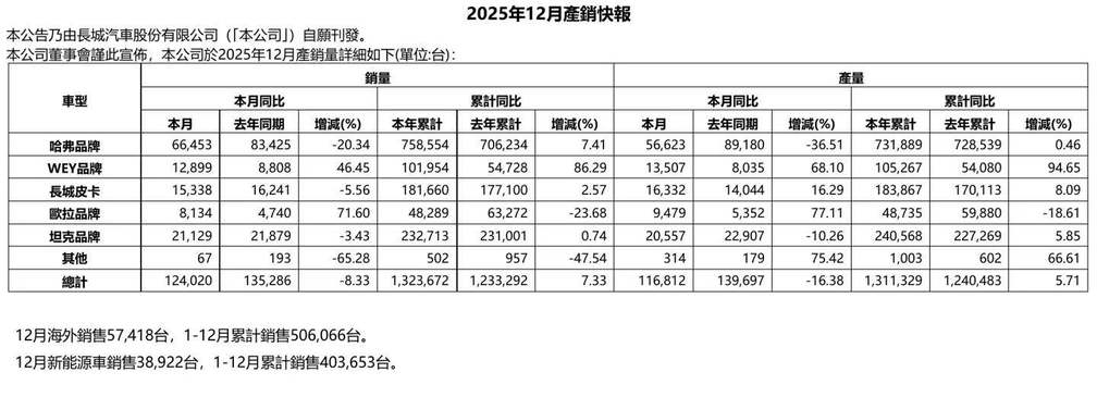 長城汽車則以7.33%的同比增長,創下年度銷量新高。其新能源車型銷量達40.37萬輛,占總銷量的比重超過30%,而海外銷量占比更是高達38.2%,兩大戰略板塊均刷新歷史紀錄。