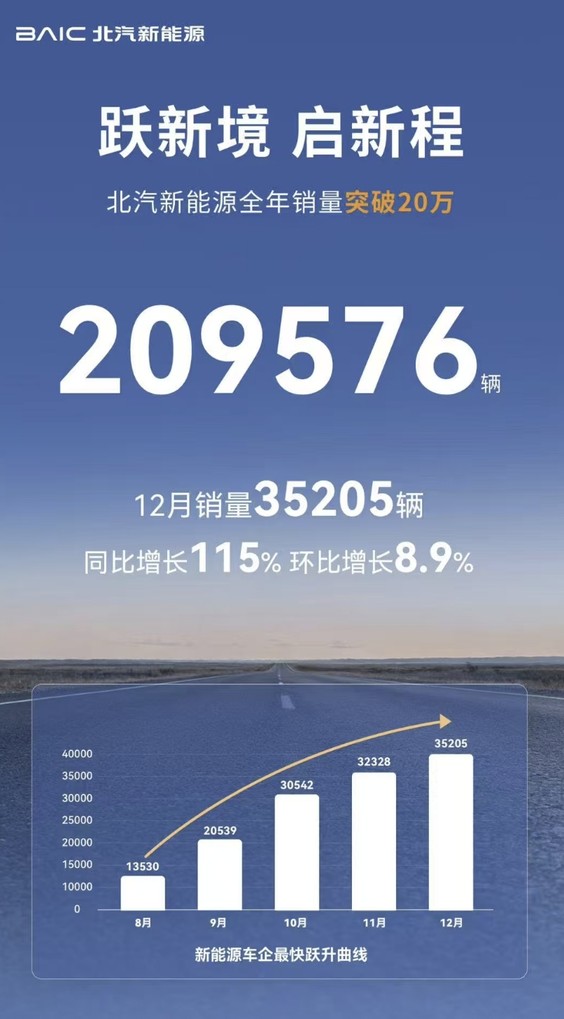 5、北汽新能源全年銷量20.96萬輛,難得的是,12月銷量3.52萬輛,同比增長115%,環(huán)比增長8.9%,自8月起月銷由1萬輛躍升至3萬輛規(guī)模。