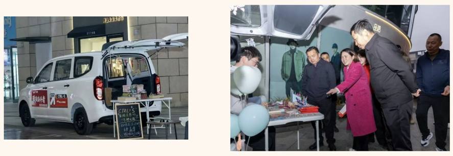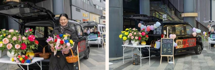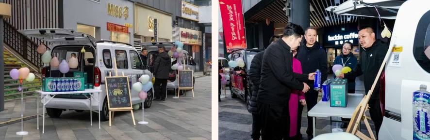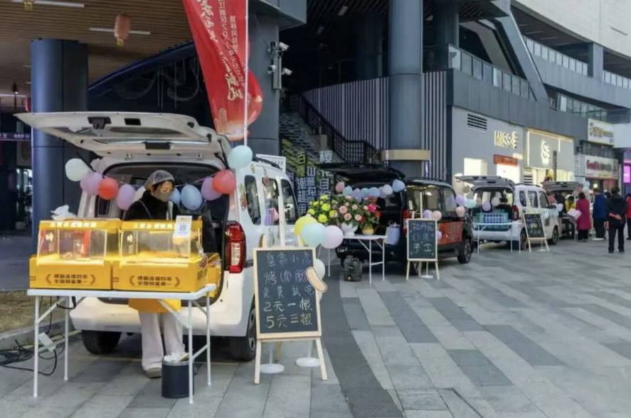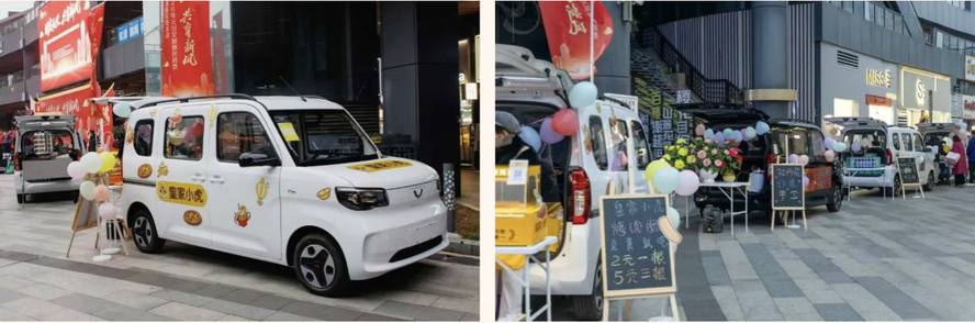 在陽光100鳳凰街的核心區域,五菱和寶駿新能源汽車以其靈活的改裝形態,成為了本次大學生創業車尾箱集市的“高光載體”: