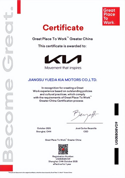 值得關(guān)注的是,在行業(yè)極度內(nèi)卷的背景下,悅達(dá)起亞積極推進(jìn)組織文化變革,構(gòu)建了企業(yè)與員工和諧共生、雙向賦能的職場(chǎng)生態(tài),深入踐行“以人為本”的長(zhǎng)期主義發(fā)展理念。憑借在職場(chǎng)文化、人才梯隊(duì)、員工關(guān)懷等領(lǐng)域的卓越實(shí)踐,悅達(dá)起亞以93%的員工信任指數(shù),高分榮獲全球權(quán)威職場(chǎng)文化評(píng)估機(jī)構(gòu)——Great Place To Work? (卓越職場(chǎng)研究所)頒發(fā)的“卓越職場(chǎng)”認(rèn)證,成為2025年中國汽車行業(yè)唯一獲得此項(xiàng)殊榮的汽車企業(yè)。
