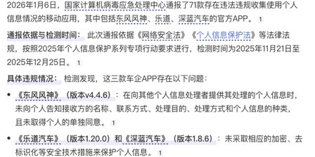 與此同時,根據最新消息:1月6日,有71款APP被通報存在違法違規收集使用個人信息情況,其中包括東風風神、樂道、深藍3家汽車企業APP。
