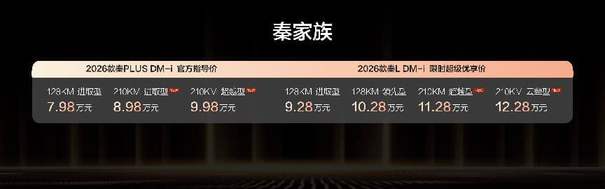 1月8日,比亞迪秦家族迎來重磅加推,2026款秦L DM-i /2026款秦PLUS DM-i 210KM長續航版雙車同步上市,售價8.98-12.28萬元。其中,2026款秦L DM-i 210KM長續航版限時超級優享價11.28-12.28萬元,2026款秦PLUS DM-i 210KM長續航版售價8.98-9.98萬元。同時,兩款車型均帶來了豐厚的上市權益禮。