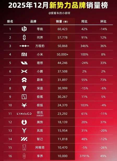 12月新勢力品牌銷量榜發(fā)布:“蔚小理”掉出前三,小米排第四
