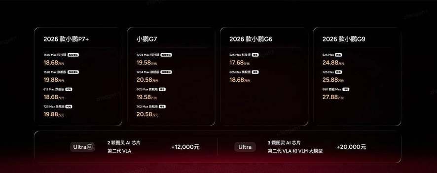2026年1月8日,在2026小鵬全球新品發布會上,小鵬汽車正式發布2026 款小鵬 P7+、小鵬 G7 超級增程、2026 款小鵬 G6、2026 款小鵬 G9。其中2026款小鵬P7+ 全球36國同步發布,新車有超級增程和純電兩種能源形式,超級增程有1550 Max 科技版和1550 Max 旗艦版,官方指導售價為18.68萬元和19.88萬元;純電有615 Max旗艦版和725 Max 旗艦版,官方指導售價為18.68萬元和19.88萬元。2026款小鵬G7推出四個版本,超級增程1704 Max 科技版和1704 Max 旗艦版,官方指導售價為19.58萬元和20.58萬元;純電602 Max 旗艦版和702 Max 旗艦版,官方指導售價為19.58萬元和20.58萬元。2026 款小鵬 G6推出純電625 Max 科技版和625 Max 旗艦版,官方指導售價為17.68萬元和18.68萬元。2026 款小鵬 G9推出純電625Max、725 Max和680 四驅Max版,官方指導售價為24.88萬元、25.88萬元和27.88萬元。