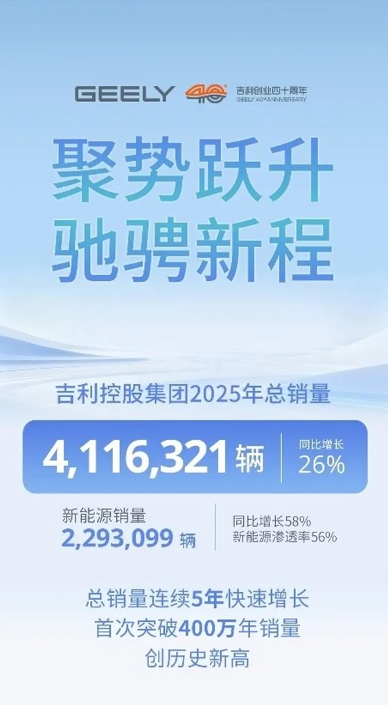 2025年,吉利控股集團全球總銷量4,116,321輛,同比增長26%,實現連續五年快速增長,年銷首次突破400萬大關,創歷史新高;其中新能源銷量2,293,099輛,同比增長58%,新能源滲透率56%,成為集團市場增長的主要驅動力,在全球車企中處于領先地位。