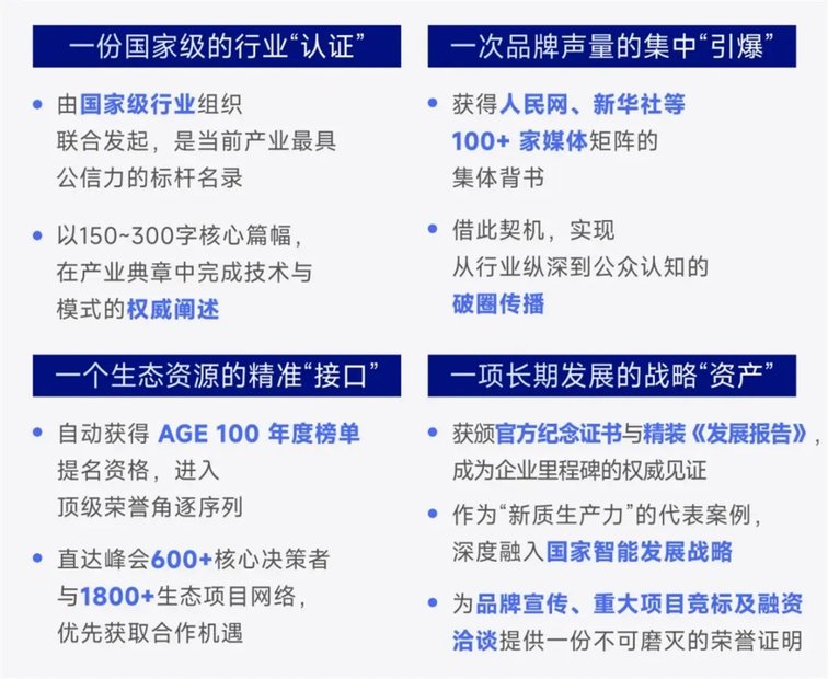 值此關鍵節點,《中國未來智能生態圖景發展報告》的編纂工作,也在多家國家級權威機構的支持下,正式啟動,并將于峰會現場聯合100家媒體正式面向全球發布。與常規的案例征集不同,本次報告是一次面向產業核心圈層的“限量邀約”——旨在聯合匯聚定義未來的關鍵力量,由300+家AI核心企業案例共同繪制引領未來十年發展的生態格局圖與價值坐標體系。