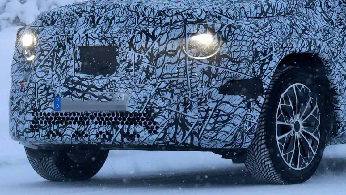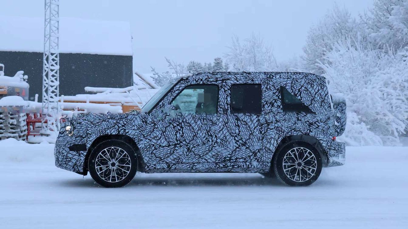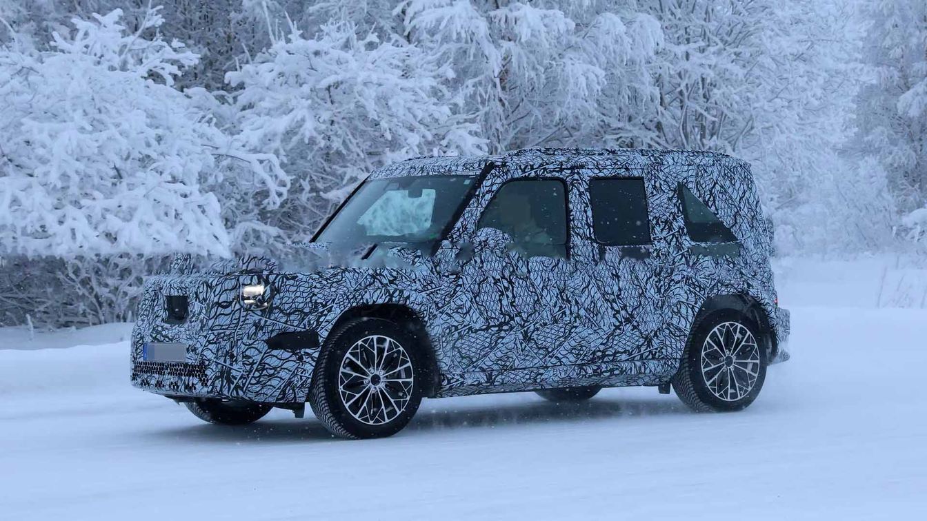 外觀上來看,這款迷你版G級沿襲了大G的方正設計風格,雖然它披著厚厚的全車偽裝,但整體的比例依然非常清晰,前臉采用圓潤的車頭造型,兩側配備了標志性的圓形大燈。具體來看,這臺小G的車身輪廓棱角分明,依然是非常硬朗的視覺姿態,發動機蓋與車頂基本保持了平直,輪眉的寬體設計則為方正的車身線條增添了一絲的變化,另外,該車配備了不對稱的雪花狀輪轂,看起來也很有識別度。