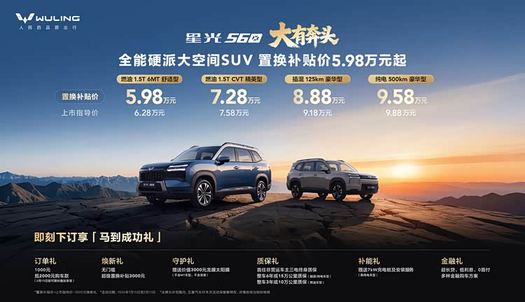 2026年1月15日,五菱的全新的重磅SUV星光560正式上市。新車推出四款配置車型,包括燃油1.5T 6MT舒適型、燃油1.5T CVT精英型、插混125km豪華型及純電500km豪華型,上市指導價區間為6.28萬元-9.88萬元,置換補貼價低至5.98萬元-9.58萬元,即日起至2月15日期間下單可享受廠家專屬禮包。