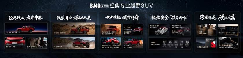 北京越野董事長王昊表示,BJ40作為中國越野的領路者,親歷過無數盛事榮耀,也成為中國汽車的獨特文化符號,在全球用戶的認可中走入了萬千家庭。BJ40以探險家的名義,開啟全新征程,在經典設計、自由改裝、專業性能、極致安全和跨圈舒適五大維度再造新經典,為中國越野車市場再造經典專業越野SUV。