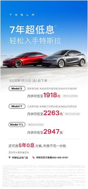 值此2026年初購車黃金窗口期,特斯拉首次上線7年超低息金融計劃,覆蓋Model 3與Model Y主力車型:Model 3首付僅需7.99萬元,月供低至1918元(日供約63元);全球銷量冠軍Model Y月供低至2263元(日供約74元),年化利率不足1%,大幅緩解家庭月度用車壓力。同時,Model Y L同步推出5年0息(月供3985元)與7年超低息(月供最低2947元)雙重金融選擇,精準匹配中高端家庭的用車升級需求。
