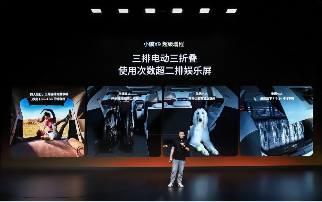 空間靈活性同樣領(lǐng)先行業(yè),小鵬 X9 超級(jí)增程滿足用戶豐富出行場(chǎng)景需求。全球首發(fā)的三排電動(dòng)三折疊功能,隨時(shí)化身可一鍵切換的“移動(dòng)LOFT”。該車支持三排4/6分獨(dú)立收納,可無縫切換7座滿員、6座帶寵物、5座載自行車、4座露營(yíng)大床房等多元模式,真正實(shí)現(xiàn)一車搞定通勤、帶娃、社交、遠(yuǎn)行多種出行場(chǎng)景。