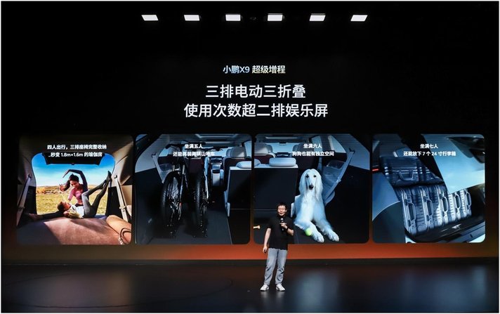 空間靈活性同樣領先行業,小鵬 X9 超級增程滿足用戶豐富出行場景需求。全球首發的三排電動三折疊功能,隨時化身可一鍵切換的“移動LOFT”。該車支持三排4/6分獨立收納,可無縫切換7座滿員、6座帶寵物、5座載自行車、4座露營大床房等多元模式,真正實現一車搞定通勤、帶娃、社交、遠行多種出行場景。