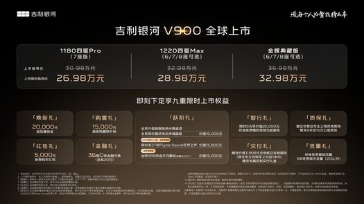1月20日,吉利銀河豪華V系列首發之作,“AI全場景家庭旗艦MPV”——吉利銀河V900正式上市,共推出3個車型,上市限時指導價26.98萬元-32.98萬元。即日起,用戶可通過吉利銀河APP、微信小程序、抖音小程序及官網等官方渠道下訂,下訂即享煥新禮、購置禮、紅包禮、金融禮、智行禮、質保禮、交付禮、流量禮、躍階禮九重購車好禮,超高價值,一次滿足,誠意拉滿。